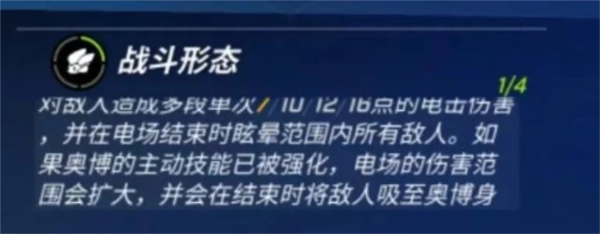 被动天赋-战斗形态:奥博在战斗形态下,对周围持续产生电厂造成电击伤害,如果奥博的主动技能已被强化,就还可以扩大电厂的范围,并在结束时将敌人吸附至奥博身边。另外在电能结束时还可以眩晕范围内所有敌人。