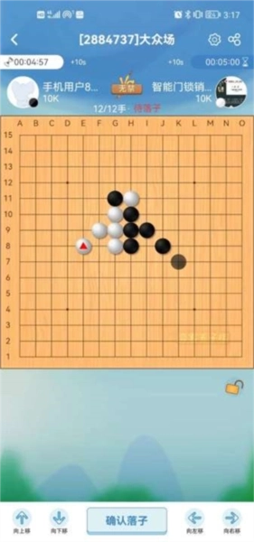 3、匹配完成后我们就能开始游戏啦,规则想必大家都清楚吧!只要在横竖撇捺任一方向连成五个棋子就算赢,我们每放好一颗棋子,点击下方的“确定落子”按钮就可以了。