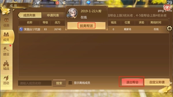 1、玩家在【帮会】-【成员】页面右下角可点击【退出帮会】,或者左键单击成员列表中自己的名称,也可脱离帮派。