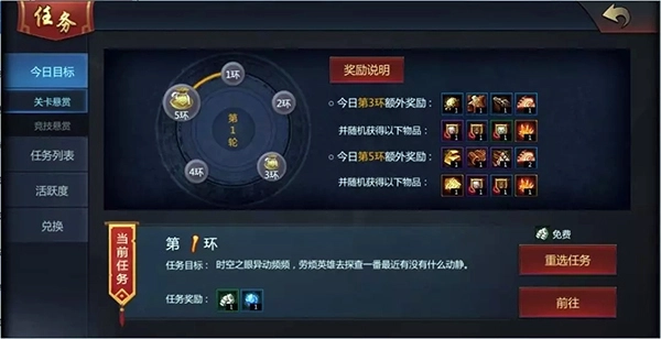 首先映入眼帘的是今日目标,今日目标中包括关卡悬赏和竞技悬赏,这些都是一些每日任务。在关卡悬赏中,还有特殊的跑环任务,不仅能领取每个环的奖励,完成第3环与第5环还能获得额外得奖励