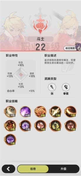 战士进阶为斗士(高速度+六边形)和骑士(高防+嘲讽+反伤)