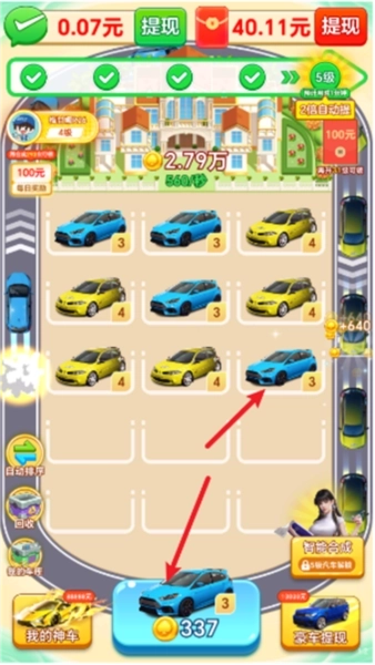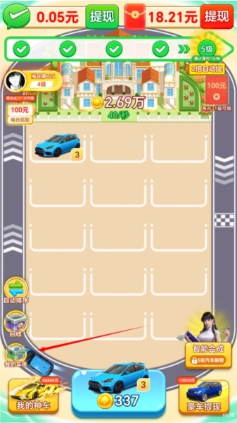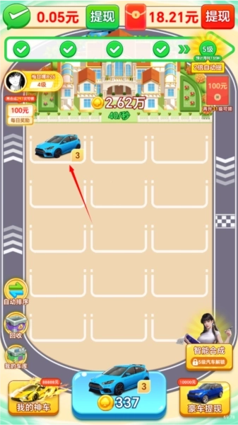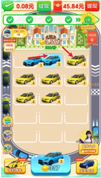 5、这款趣味合成小游戏特别适合用来放松休闲,而且当合成出5级豪车后,自动合成功能就会解锁,这样升级拿奖励就变得轻松多啦!
