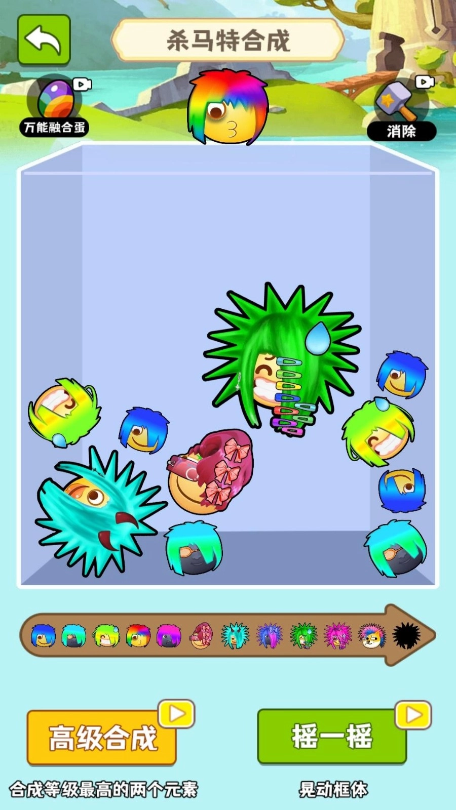 1、对准盒内相同的角色进行投放,让它们碰撞合成更高级的角色,以此不断提升角色等级。