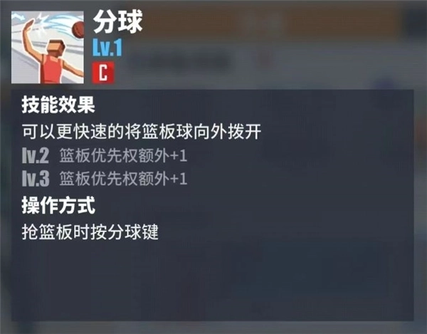 分球:能更迅速地把篮板球向外拨开。lv.2时篮板优先权额外增加1;lv.3时篮板优先权同样额外增加1。这是C的基础技能之一,其优先级更高。有时即便卡位成功限制了对位球员,篮板仍可能被对方夺走,合理运用分球,便能在篮板争夺中占据优势。
