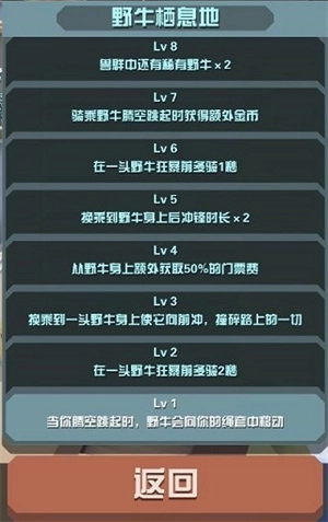目前每种动物都配备8个技能,拿野牛来说,Lv1时只要你跳起,地图里的其他野牛就会朝你所在位置聚集,这能减少换乘过程中的失误概率;Lv2能延长在同一只野牛身上的骑乘时长,使野牛没那么容易进入狂暴状态;Lv3可让野牛解锁冲刺能力,换乘瞬间还能拥有短暂的无敌效果……完成这些等级升级后,野牛的实用价值显然会得到大幅提升。
