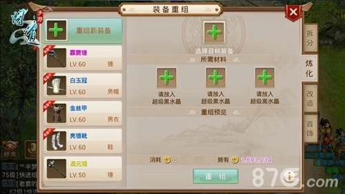 紧接着就可以进行装备重组啦,装备重组可以将上一步骤中超级黑水晶中的属性附加到想要合成的目标装备,每次重组需要投入3颗与目标装备同等级同部位且不同属性的超级黑水晶。重组后会生成带有3颗超级黑水晶属性的目标装备,属性为蓝属性,装备为蓝装备,值得一提的是重组是必定成功的。