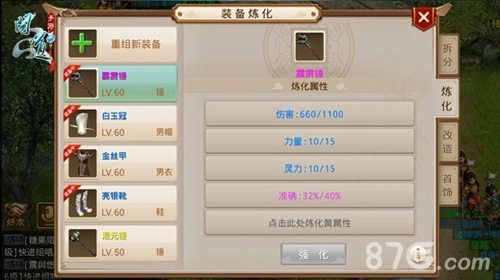 完成装备重组之后,60级以上的装备可进行装备炼化,装备炼化为的是让装备出现其他附加属性。装备属性炼化需要消耗相应属性颜色的超级水晶(如:粉属性炼化需要消耗超级粉水晶),炼化之后可查看相应属性是否是自己所希望的,如若不是,重新炼化即可。PS:蓝属性只能强化哦!