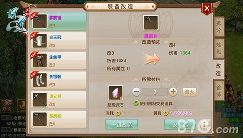 除了上述所说的四个步骤之外,装备改造也可以提升武器伤害及防具防御能力,改造最高可达到12级,每次改造需要消耗2-6个材料,耗材越多成功率越高。即便是改造失败也会累积完成度,当改造完成度达到100%之后改造必定成功。