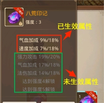 (2)强化可提升八荒印记强度,并增加一条属性条数,生效条数受驻地等级影响。