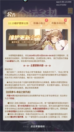1、打开命运圣契游戏会先给玩家弹一个公告,其中活动公告可以重点关注一下,有时候会有很多的福利可以领;如果玩的少可以看下防骗公告;更新公告主要用于体力规划方面。