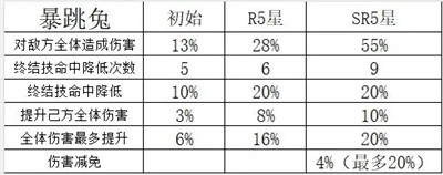 暴跳兔主战时,主要有4种加成,其中伤害减免是升级为SR时额外增加的,终结技命中降低与提升己方全体伤害。通过升级数值提升不是很大,SR后对敌方全体造成伤害提升较大。