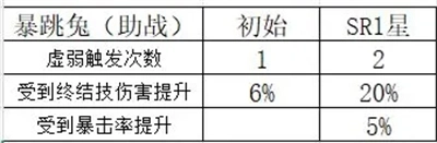 暴跳兔助战时,释放【虚弱】天赋,使我方对敌方终结技伤害提升,SR进化后对指定敌方暴击率提升。通过升星获得的数值加成较低。