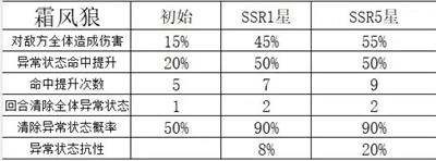 霜风狼主战时,可以提高终结技异常状态命中概率,回合结束清除全体异常状态。SSR进化后,额外增加了异常状态抗性,异常状态命中提升与清除异常状态概率不会再增加,对敌方全体造成伤害提升也小,星辰建议升级到SSR1星停止。