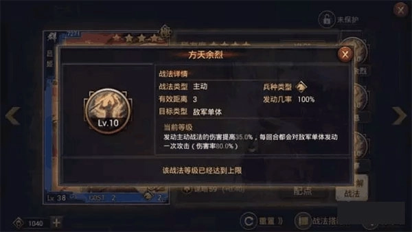 方天余烈的效果是让自身主动战法伤害提升35%,同时每回合对敌军单体造成一次80%攻击的伤害。瞧见这100%的发动概率和每回合稳定的伤害数值,你是不是会联想到关妹?那就来把它俩对比一番吧。
