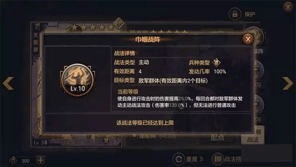 中军选用大乔,属性点全部加在谋略上,战法搭配【三军之众】与【避其锋芒】;凭借这两个战法来替代张机的功能,同时大乔自身的战法具备一定输出能力,能够弥补大营输出的欠缺。