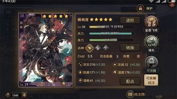 出人意料的是,汉吕布在这支队伍里反倒是最不起眼的那个,我们甚至可以考虑不优先给他觉醒——毕竟五星武将的觉醒成本确实不低。吕布的成长属性其实挺好的,攻击、防御和速度都属于偏高的类型,只是他的主动战法效果比较一般。金吾飞将仅仅是个单体伤害技能,所以表现不算突出,数值上甚至还比不上车悬。不过相对而言,它提供的控制效果倒是不错,100%的控制让吕布能担任队伍的半输出位,战法搭配上可以选择锋矢这类适合战法型骑兵的辅助技能。