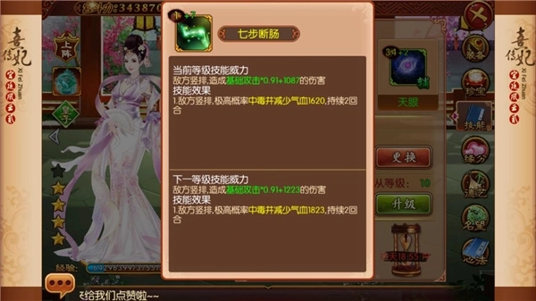 四个主技能都是基础攻击*系数+固定伤害,技能效果除了七步断肠有伤害,其他技能都是眩晕、昏睡这样的辅助技能。这样每次升级主机能除了固定伤害会有所增加之外,技能的效果其实并没有太大的差别,而每一级所加的固定伤害也是了了。而副技能攻击作用效果是直接加在基础攻击中的,会对整个对战过程起到作用,更加有用。所以御医在升级技能时先优先升副技能攻击,其次是主机能,最后是副技能命中。