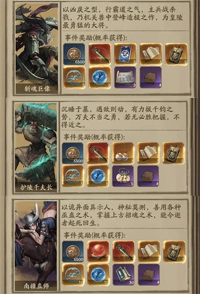 一、探索地图点出的怪的奖励不同,个人需求不同,目标怪的方向也不同。目前情况,多数玩家的目标是占地3*3的战魂巨像、护陵千夫长、南疆蛊师。