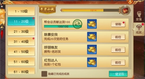 成就任务的数量相当可观,差不多每达成一项成就都能得到元宝奖励,建议尽可能完成这些任务来获取元宝。