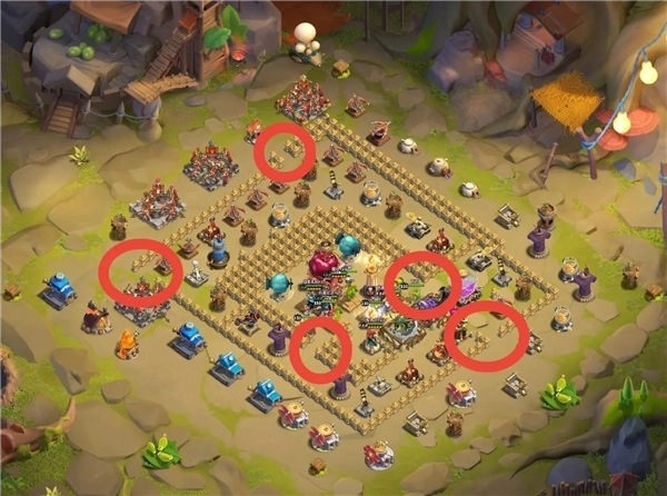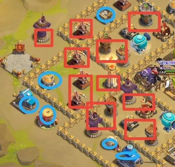 3、不能联排没有格挡物的摆放防御建筑。会被一路被平推掉防御建筑,缺少攻击手段就是羊羔。(方框:防御建筑,椭圆:资源建筑)