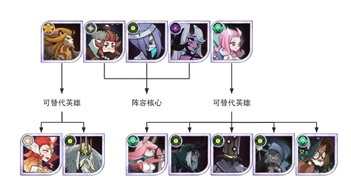 中期我们采用商魅呆阵容,具体成员包括商人、狮子、呆萌、魅魔(紫品质的魅魔就能上场,但最好能追至红色品质并达到30专属)以及蝴蝶。其中狮子和蝴蝶这两个位置,可以根据实际情况替换成兔弓、骨弓、凤凰、奈拉、三眼、皮帕等英雄。