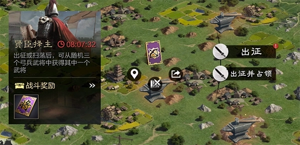 -地图事件:地图定期刷新“贤臣择主”(获特定五星武将)、“战法研习”(获S级战法)、“名匠献宝”(获锻造宝物)等事件,奖励可上阵使用或在鸣金后兑换时代币。地图随机刷新事件稀有奖励(进阶武将、藏品宝物)对应更高时代币价值