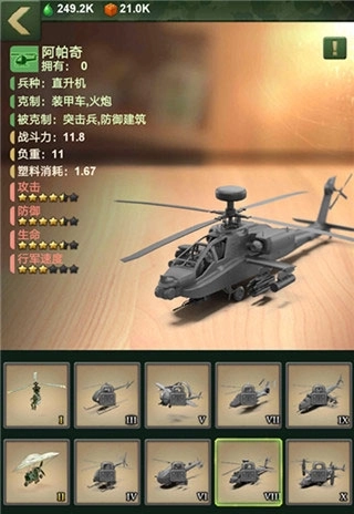 直升机工厂:训练直升机的地方,升级直升机工厂,根据等级,可以训练更多种类的直升机,有隐形直升机、阿帕奇、鱼鹰炮艇机、多用途直升机、特种攻击机等多种类直升机;