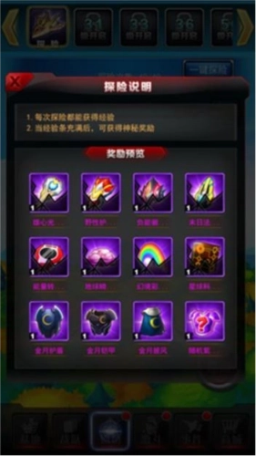 探险宝箱宝箱到底能获得什么呢?当然是好东西,看到图中一堆紫色极品装备是不是心动了呢,不仅如此还能获得随机的蓝及紫装、随机蓝及紫色宝物碎片、金色的法宝及变身器能源、还有蓝色品质的角色哦。如此丰厚的回报,让探险的乐趣再度升级。