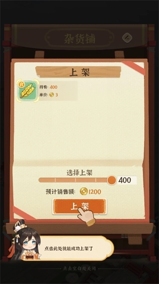 6、点击杂货铺,选择“补货上架”选项,即可将食品上架售卖以赚取金币。