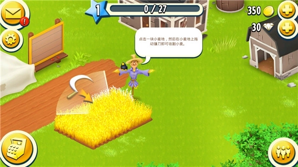 4、依据教程指引,点击小麦,选中镰刀,接着拖动镰刀收割所有小麦。