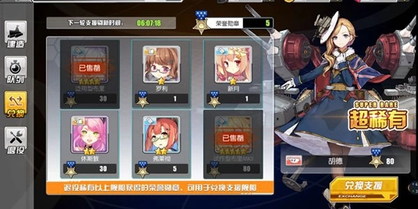 每个服务器都可以进去看一下这里推荐有“光辉”的服务器,“光辉号”是目前最强航母,推图和PVP(竞技)都有非常好表现,如果选在有兑换的服务器,可以用80勋章兑换(蓝卡退役1勋章、紫卡退役4勋章、金卡退役10勋章最好不要退役金卡会败人品)前期通过3-4天抽卡和地图掉落80功勋是没问题的(我的区暂时是胡德,只能截屏胡德了最喜欢的立绘,但这个金卡的兑换在7天后会刷新,所以在没有光辉的区也没关系,下次刷新就是光辉也说不准呢)