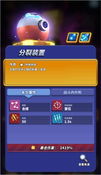 2、分裂装置:这是非常容易获取到的塔,虽然获取难度系数低,但是作用不容小觑,大部分阵容在游戏局内前期都需要它和魔镜来获取额外的防御塔和SP点。