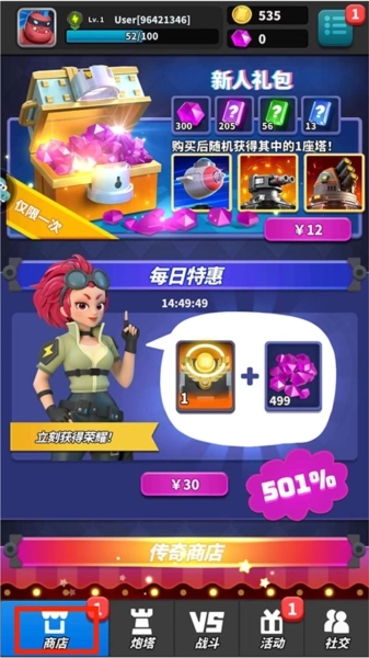 1、打开僵尸风暴游戏,进入游戏主界面,分为【商店】、【炮塔】、【战斗】、【活动】和【社交】栏目,