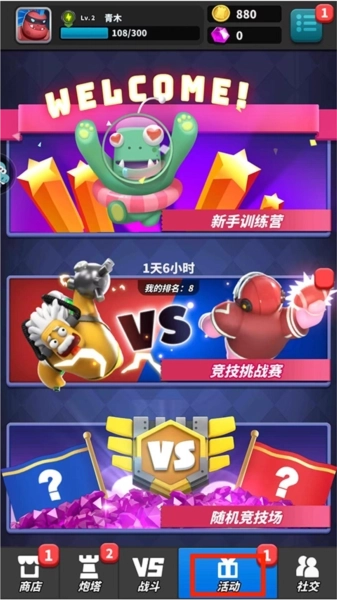 8、进入【活动界面】,包括“新手训练营”、“竞技挑战赛”、“随机竞技场”等不同的活动可以选择参加,