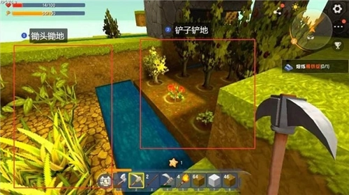 首先我们得先找到一处水源,毕竟水源周边的环境更利于农作物吸收养分。之后要在水源的两边分别进行锄地和铲地这两种完全不同的操作。这是因为在《迷你世界》里,农作物和花树草有着根本的差异:农作物只能种植在经过锄头翻耕的土地上,而像树苗、鲜花这类植物,则必须种在使用铲子挖好的土坑里才行。
