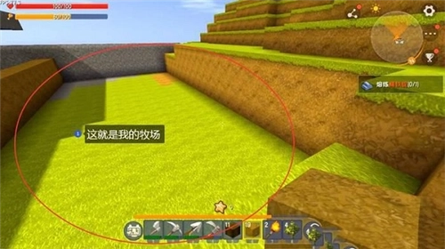 第三步,用动物喜爱的食物,慢慢引导它走到牧场的边上。我们先顺着梯子下去,动物就会自己跟着跳下来。最后我们再从梯子爬回牧场,好好看看这片属于自己的热闹牧场吧。