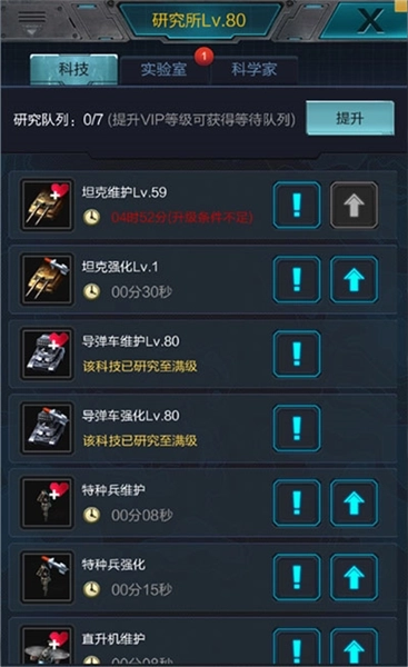 3、同一时间仅能开展一项科技研究,多项科技可进入等待队列,队列的上限受VIP等级的限制