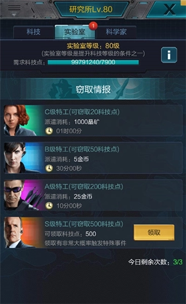 3、科技点能够通过窃取情报的途径获取,窃取情报的方式共有四种,每种方式会消耗不同的资源与时间