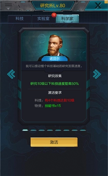 1、当科技等级研究满足相应条件后,即可消耗特定数量的技能书来激活科学家