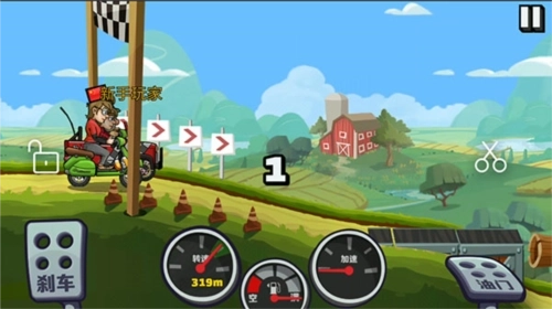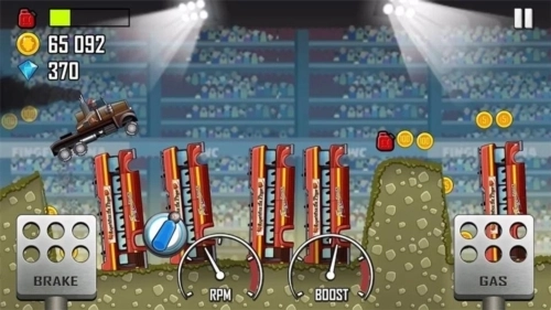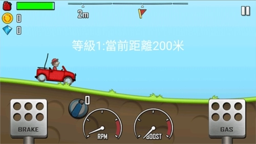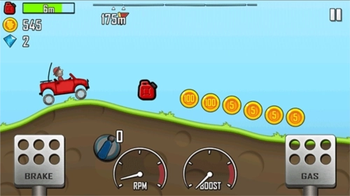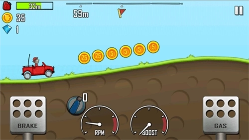 2、玩法非常简单,玩家需要控制赛车在崎岖的路面上行驶,左边按钮控制刹车,右边按钮控制油门;