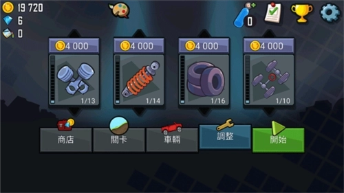 3、部件装配:在部件系统里可以对汽车增加一些新的部件,增加汽车的性能。在新手阶段,比较推荐带重型、磁石、着陆助推力三种部件。重型可以增加赛车的重量,降低赛车的重心,使赛车在行驶时能够更加的平稳。磁石可以收集燃料和半径更宽的金币,可以更快的积累足够的金币来对赛车进行改造升级。着陆助推器可以在赛车跳跃落以后,获得一段冲刺,拉开与其他赛车的距离,获得更高的评价。