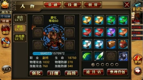 历史传记:廖化,曾担任关羽的主簿一职,他性情刚直但才能较为普通。“蜀中无大将,廖化作先锋”这句俗语,恰恰反映了三国后期蜀汉人才极度匮乏的历史状况。其初始属性(裸装1级状态)如下:生命值2012,成长值200,物理攻击力125,技能攻击力63,物理防御力85,技能防御力45。