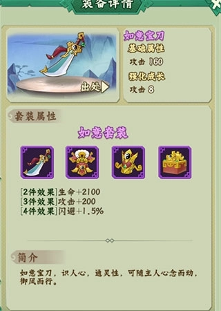 游戏里的紫色装备主要有降妖套装和如意套装两类,它们分别适配输出型角色与坦克型角色。输出类角色建议选择降妖套装,坦克类角色则更适合如意套装。如意宝刀是除小金刚外所有坦克类葫芦娃的缘分武器,多使用并强化它,能更有效地提升自身属性和战力。而降妖套装的核心作用是增强输出能力,因此推荐后排葫芦娃配备这套装备。