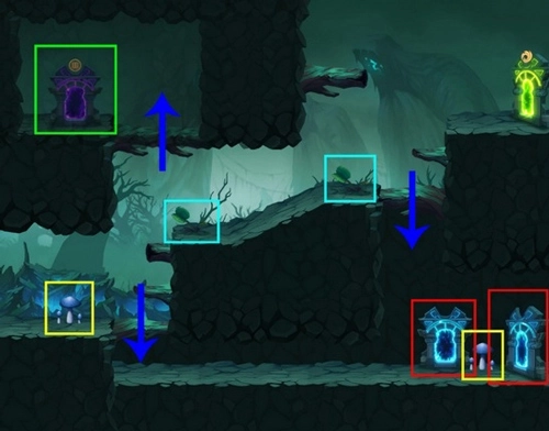 注意要点:左侧绿框区域有概率出现蓝门,上方红框处蓝门可能不会出现。下方存在毒蘑菇与蜜蜂窝。