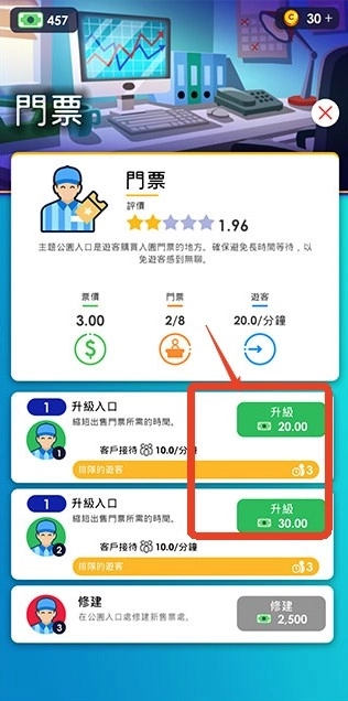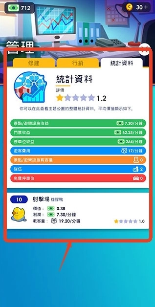 4、当资金充足时,玩家可在管理页面的修建选项中增设更多游乐设施。