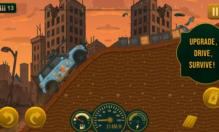 5、驾驶你的车辆持续前进直至燃油耗尽,燃油耗尽后游戏便会结束,结束后系统会依据你行驶的距离发放相应数量的金币。