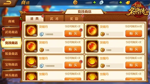 突破丹可在武将商店、竞技场商店和军团商店购买,兑换时需消耗将魂、威望以及军团贡献。