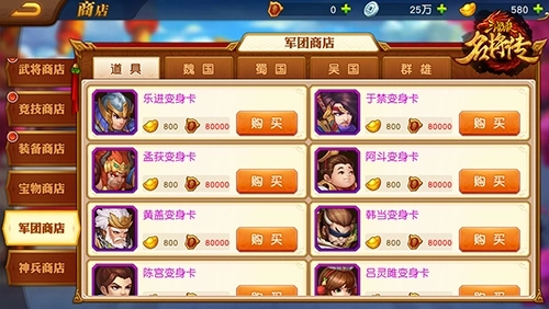 使用军团贡献并花费少量元宝,就能购买到部分紫色武将变身卡。