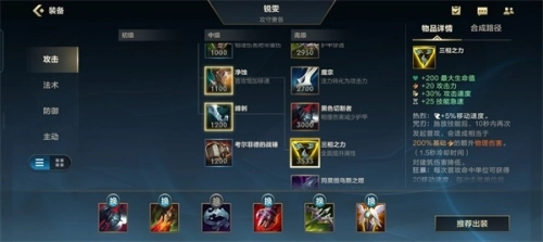 作用:三相这件装备能显著提升多项属性数值,其附带的技能效果是——在我们释放技能后,接下来的普攻会获得额外伤害加成,这使得我们在技能释放后打出的普攻伤害相当可观;同时它还能增加自身移动速度(不过对远距离攻击英雄而言,移速加成会减半)。需要注意的是,这件装备仅限近战英雄购买,而有了移速加成后,无论是追击敌人还是撤离战场都会变得轻松不少。