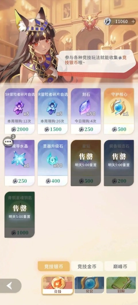 4、公会商店:建议优先兑换圣杯和守护升星自选道具。我之前为了冲击排名换了其他物品,这属于特殊情况,大家不必效仿。守护校准仪无需急于兑换,因为守护升阶有等级要求,等等级达标后若仍有需求,再兑换也不迟。